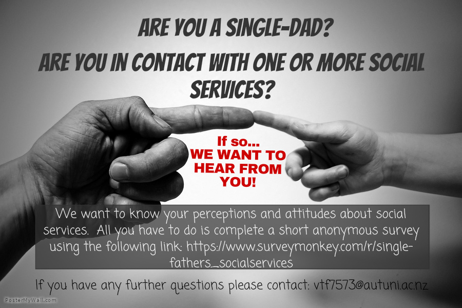 Sharon Yella of AUT is currently conducting an online anonymous survey on single-dads’ experiences and perceptions of social services. Last year, Sharon did a study that showed that single-dads weren’t always treated right by organizations such as CYFS, WINZ and even Plunket. From this she realized we needed more voices on the topic about family services that engage with fathers.