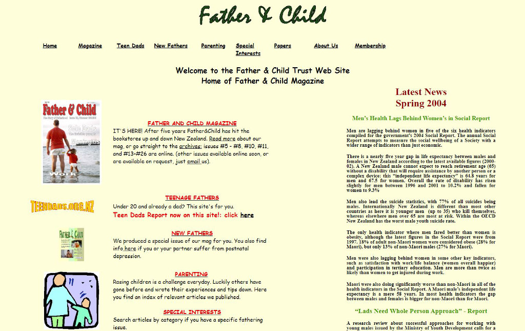 When the domain fatherandchild.org.nz was first registered at the end of 1999, it was used by the national F&C Society, and they launched a website in mid 2000. I’ve made a few screenshots from the Wayback Machine to show how history unfolded.