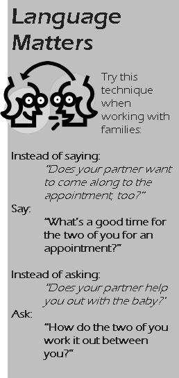 This initial approach is very important. Let’s say a midwife phones a family to make an appointment for a Well Child health check, and the baby’s mother answers the phone. The midwife can now make an appointment with her and say that it would be good if her partner would also be present. Or she could, from the start, ask what time would suit both of them (and, of course, baby).
